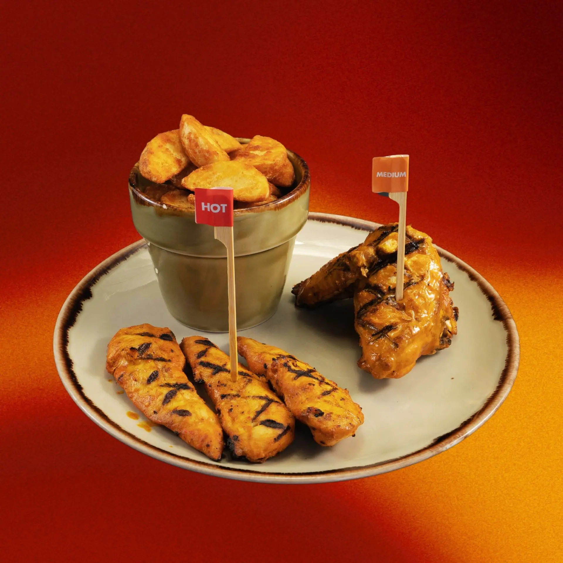 2 Flamed Grilled Whole Chicken, 8 Wings, 8 Strips, 3 Sides and 1 Bottled Drink