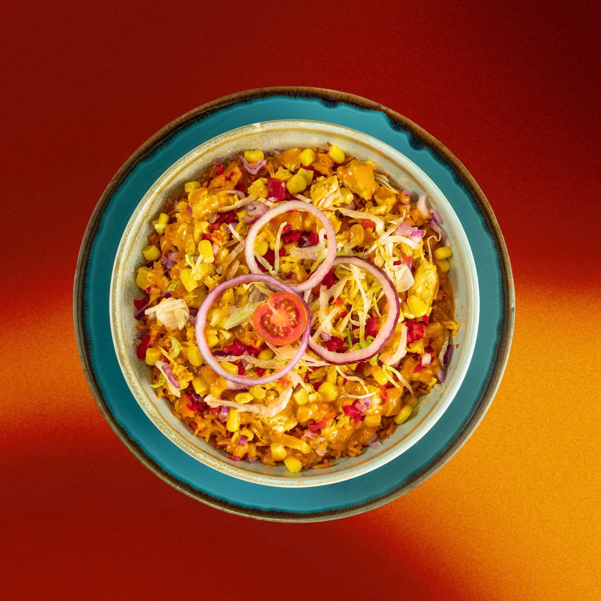Rice, Peri Chicken, Red Onions, Red Peppers, sweetcorn, Lettuce, Jalapenos, Homemade peri sauce and Homemade Garlic Sauce